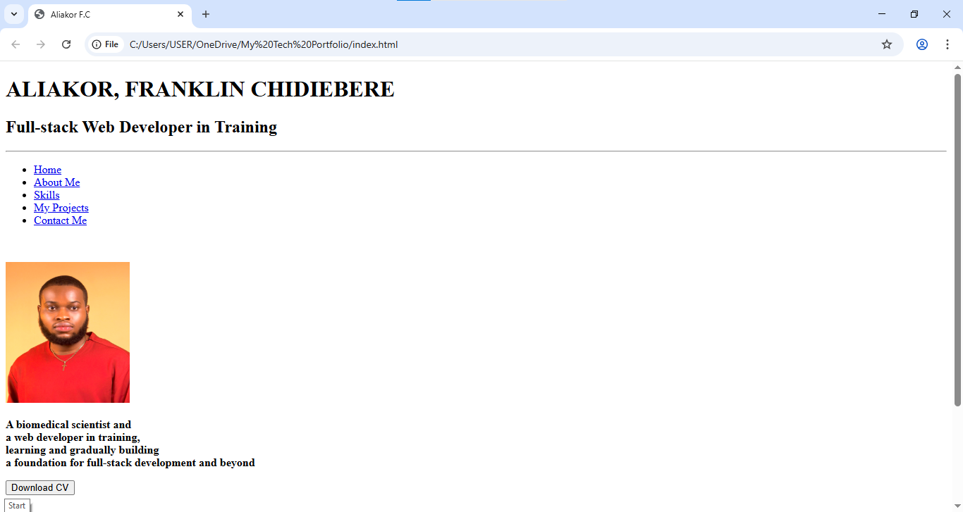 This is my personal portfolio website which I have built step by step as I walk through this exciting journey. I will continue to integrate new lessons and tools into this project as I learn and acquire skills. Stay with me.